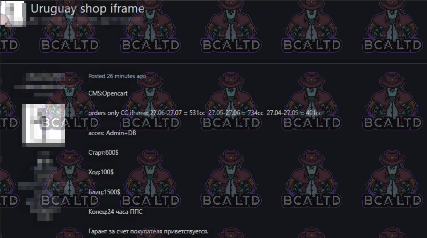 TA selling access and full DB of a Uruguayan e-commerce site with details on 1,756 card transactions. Includes admin panel and credit card iframe logs.- Country: 🇺🇾