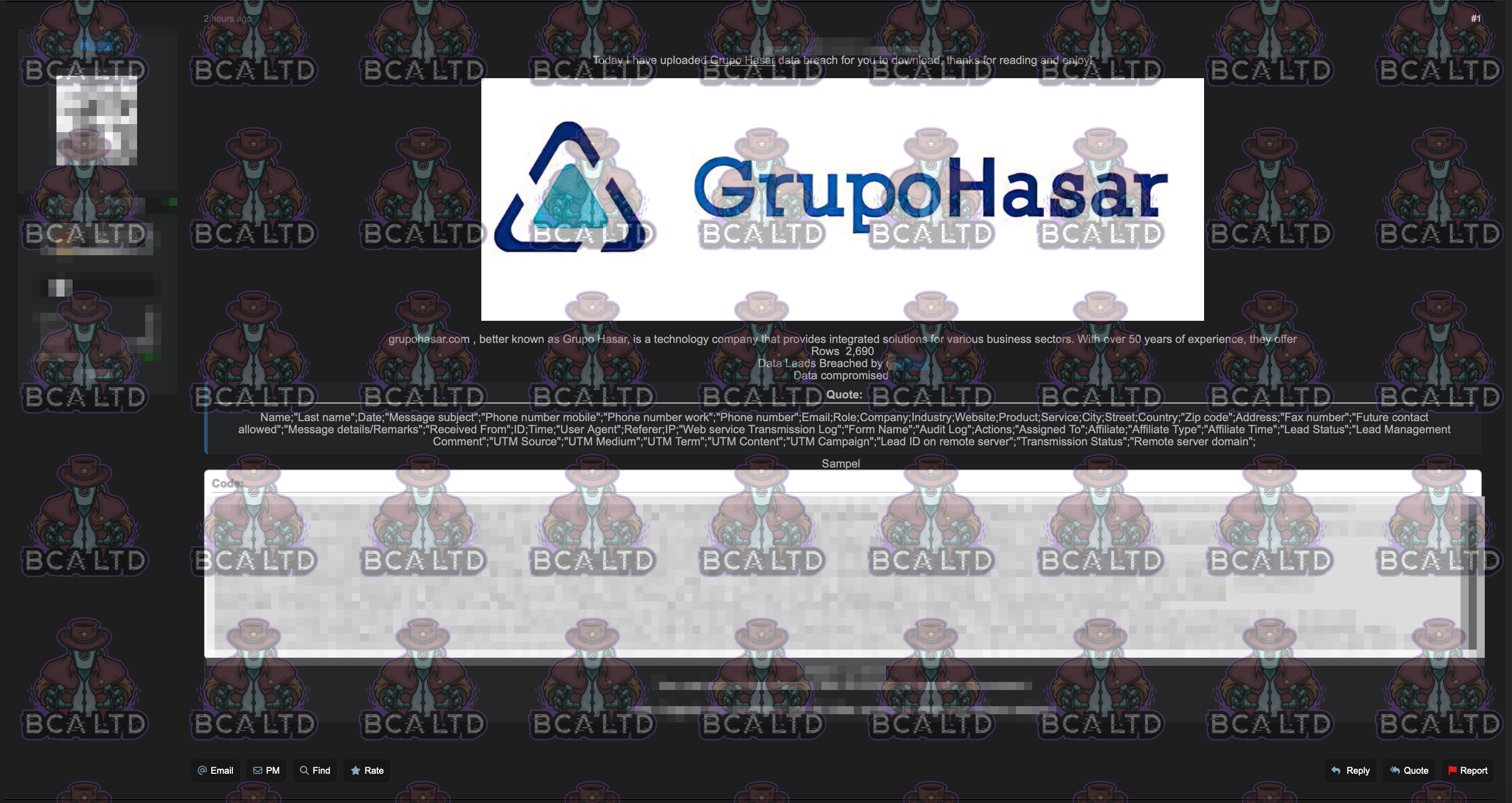 TA leaked a database belonging to Grupo Hasar, containing user data such as mobile phone numbers, email addresses, IP addresses, and support requests.- Country: 🇦🇷