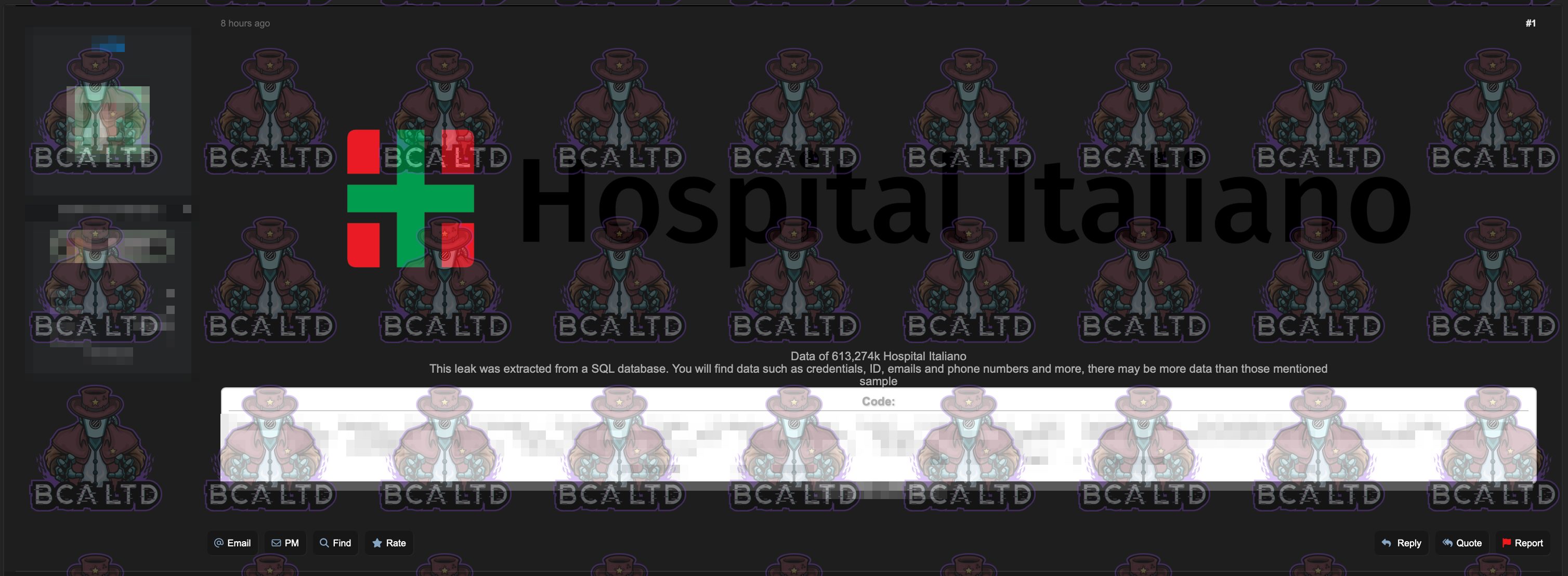 TA leaked a database from Hospital Italiano containing 613,274 patient records, including sensitive information and contact details.- Country: 🇦🇷