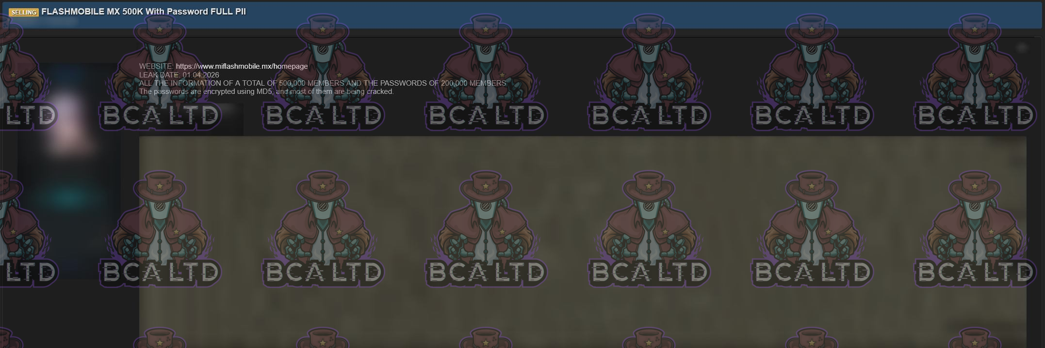 TA leaked a DB belonging to MiFlash Mobile containing 500k member records, along with MD5-hashed passwords for an additional 200,000 users.- Country: 🇲🇽