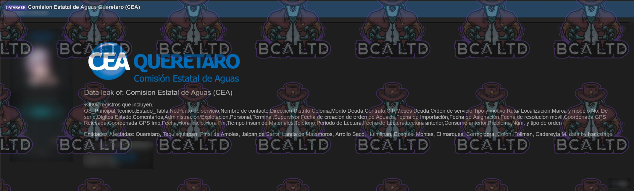 TA leaked a DB belonging to Comisión Estatal de Aguas Querétaro containing 300k records including customer contact information, billing data, service details, and GPS coordinates.- Country: 🇲🇽
