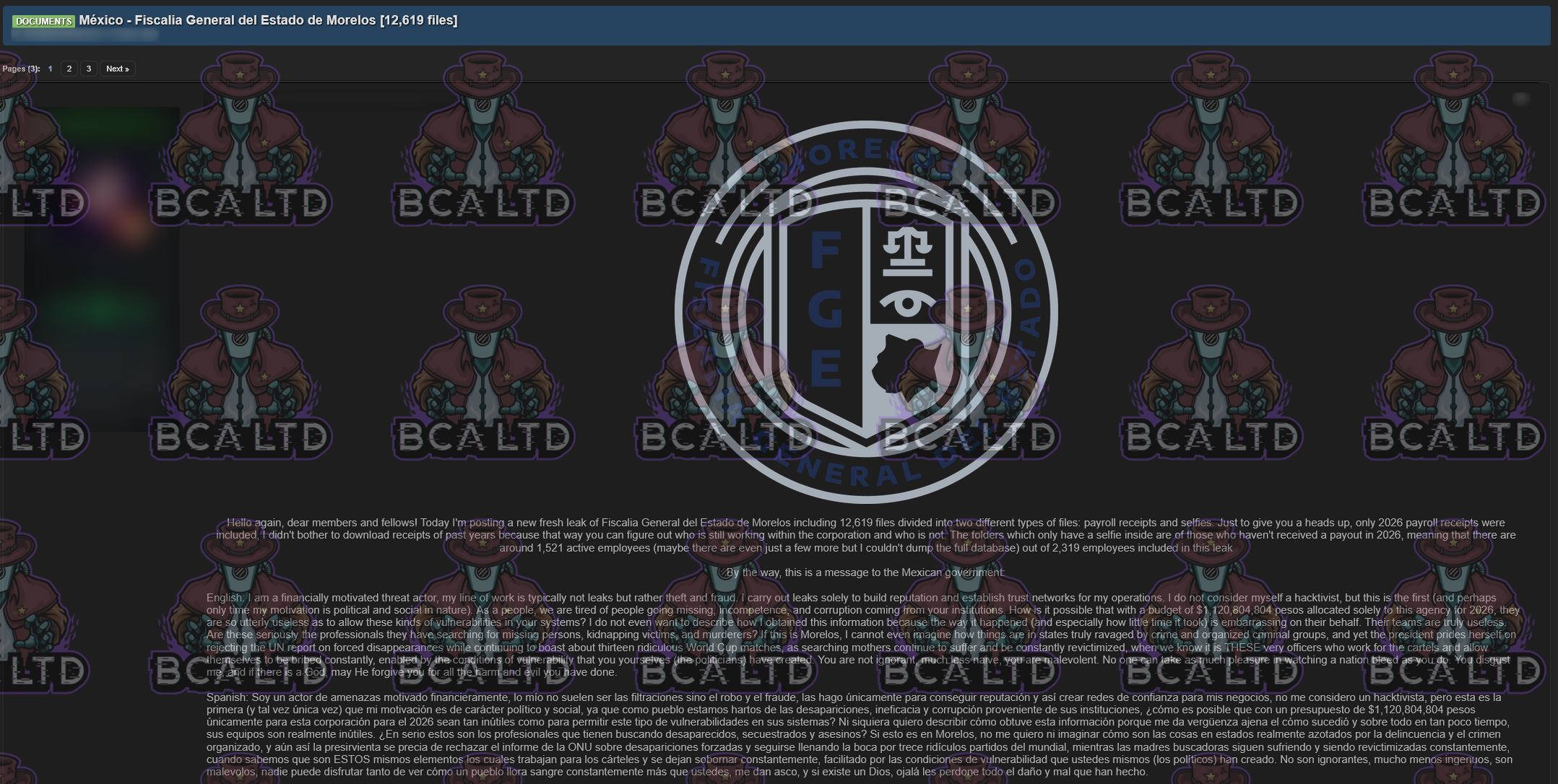 TA leaked a BD belonging to Fiscalía General del Estado de Morelos containing 12,619 payroll records and employee selfies, including information on 1,521 active workers.- Country: 🇲🇽